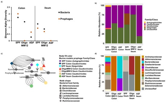 Taxonomy of prophages and putative bacterial host families in ileum and colon samples from the gnotobiotic murine models inoculated with Oligo-MM12 and ASF as well as from SPF mice. (a) Shannon alpha diversity of prophages and predicted bacterial hosts at the family level; (b) taxonomic composition of prophages; and (c) bacteria–prophage interaction network analysis displaying the phylogeny of the bacterial host phage family linked to the investigated murine models and the two gut compartments. The link line (edges) denotes the oligonucleotide homology similarity frequency used to predict the host bacteria. (d) Relative abundance of the predicted host-bacteria of prophage contigs.