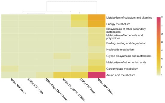 Bacteriophage-associated auxiliary metabolic genes functional categories of KEGG pathways in ileum and colon samples from the gnotobiotic murine models inoculated with Oligo-MM12 and ASF as well as from SPF mice. Darker colors represent higher level of count while lighter shade signifies lower count.