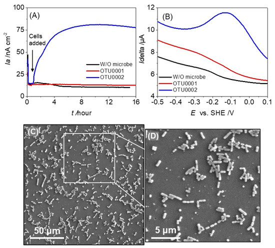 After stabilizing the current production, a differential pulse voltammogram was conducted to investigate the electrochemical properties of the cell suspension. The presence of OTU0002 resulted in a broad oxidative peak ranging from approximately −0.3 V to ~+0.1 V vs. SHE, with the maximum peak potential (Ep) at around −0.13 V (SHE) (as shown in Figure 1B).The large half-peak width of more than 200 mV (vs. SHE) is consistent with multi-heme outer-membrane cytochromes but not with soluble electron mediators such as riboflavin with that of 60 mV (vs. SHE) [27]. DP voltammetry did not show any significant peak current in the absence of microbes or the presence of OTU0001 (as shown in Figure 1B, black and red line). After several washes and dehydration, cellular attachment was observed on the ITO electrode surface for both strains using scanning electron microscopy (Figure 1C,D). This implies that the voltammetric signal is a result of the presence of redox enzymes on the surface of the microbe of OTU0002.