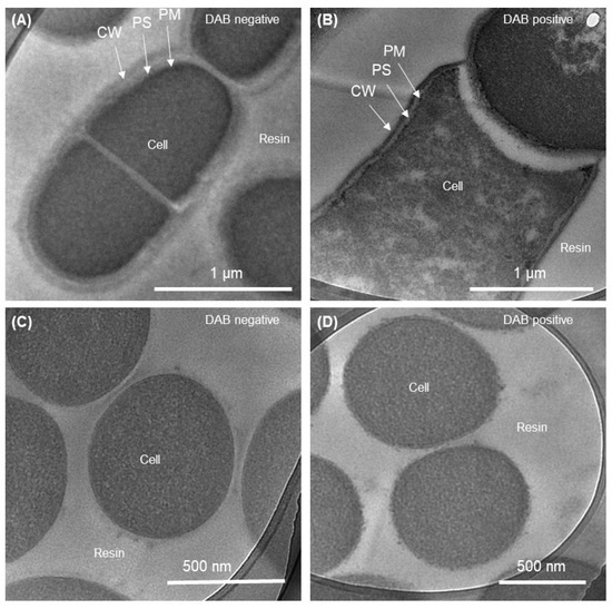 OTU0002 and OTU0001 cells stained with 3,3′-diaminobenzidene (DAB) are shown in a transmission electron microscopy (TEM) (A) and Positive DAB staining with the addition of H2O2 (B). Negative DAB stained OTU0001 in the absence and presence of H2O2 (C,D), respectively. Scale bars are shown in the images. CW: cell wall; PS: Periplasmic space; PM: Plasma membrane.