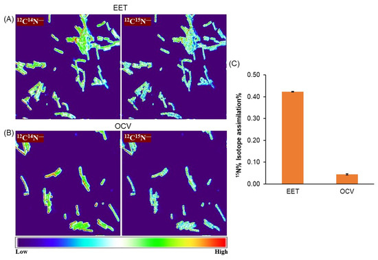 To examine the coupling of metabolism with microbial current production, we analysed the activity of cells directly attached to the electrode during EET with Nano-SIMS by measuring the uptake of 15N (the only nitrogen source) by individual cells that most likely contributed to the current production [23,29]. After electrochemical experiments, we rigorously washed the electrode surface to remove planktonic or weakly attached cells on the electrode to analyse the anabolic 15N assimilation of cells by measuring 15N/Ntotal (%) and subtracting the natural abundance of 15N. In the single-potential amperometry condition, OTU0002 under the current production condition presented a significantly higher 15N (0.4%) anabolic activity during EET (Figure 3A). In contrast, the 15N assimilation was almost tenfold smaller in the OCV condition (Figure 3B,C). This distinct anabolic metabolic activity demonstrates the coupling with the current production of OTU0002.