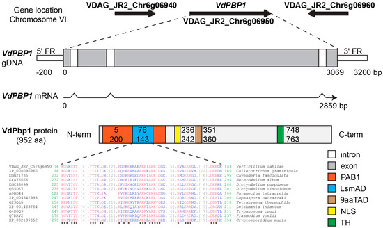 Gene locus and structure of VdPBP1. Genomic DNA was compared with cDNA using Multalin. Introns and exons were marked. The nuclear localization signals (NLS) predicted by the SeqNLS software are displayed. The protein domains were predicted by three different programs: Pfam, NCBI blast, and 9aaTAD. Sequence alignments of the LsmAD domain of VdPbp1 and related proteins from other organisms including Colletotrichum graminicola (XP_008096966), Cavenderia fasciculata (EGG21785), Heterostelium album (EFA76666), Dictyostelium purpureum (EGC33099), Dictyostelium discoideum (Q55DE7), Paramecium tetraurelia (A0BD44), Capsaspora owczarzaki (XP_004342993), Tetrahymena thermophila (Q23QL5), Leishmania infantum (XP_001463764), Trypanosoma cruzi (Q4D0Q9), Plasmodium yoelii (Q7RRV2), and Cryptosporidium muris (XP_002139652) are displayed. Asterisks and red: identical residues, blue: low (50%) consensus values; green: the start and end site of alignments sequence; FR: flanking region; N-term: N-terminus; C-term: C-terminus; PAB1: PAB1-binding domain; LsmAD: LsmAD domain; 9aaTAD: nine-amino-acid transactivation domain; NLS: nucleus localization signal; TH: transmembrane helix.