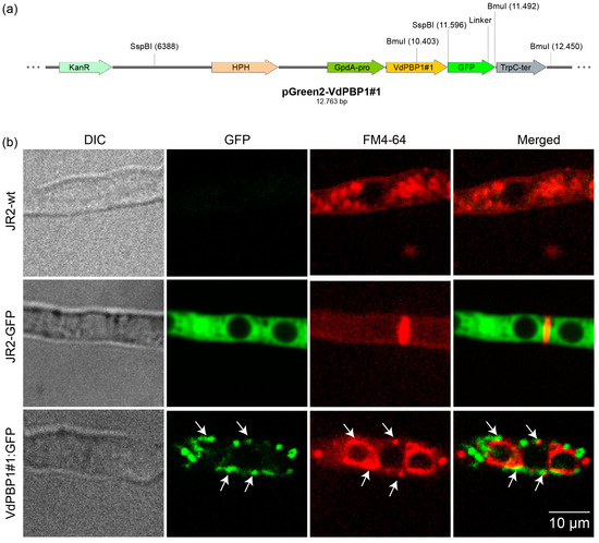 VdPbp1 is a vesicle protein. The VdPBP1#1 fragment, driven by the GpdA promoter, was fused to GFP, separated by the GGSGG linker, and introduced into the JR2-wt strain through ectopic transformation. Transformants were selected on selective medium containing hygromycin (50 µg ml−1) and then examined using fluorescence microscopy. Positive clones displaying a strong GFP signal were cultured in liquid SXM for 24 h. The localization of proteins was observed through green fluorescence, while fungal vesicles were visualized with FM4-64 (N-(3-Triethylammoniumpropyl)-4-(6-(4-(Diethylamino) Phenyl) Hexatrienyl) Pyridinium Dibromide) staining and indicated by red color. The strain names and filters used are indicated. Scale bars are illustrated. Arrowheads indicate vesicles. (a) The pGreen2-VdPBP1#1 construct (b) The localization of VdPBP1 proteins.