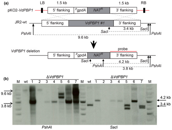 The recombination plasmid pKO2-VdPBP1 was confirmed by PCR and digestion with restriction enzymes before introducing into the JR2-wt strain via Agrobacterium tumefaciens AGL-1 [18,22] to generate Δ VdPBP1 (Table 1). The fungal transformants were selected on potato dextrose agar (PDA) containing nourseothricin (50 µg mL−1) and cefotaxime (100 µg mL−1). The deletion strains were confirmed by Southern hybridization.
