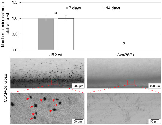 Equal quantities of spores from the JR2-wt, deletion, and complementation strains of VdPBP1 were introduced onto a 3% cellulose (w/v) medium. The cultures were then incubated at 25 °C for a duration of seven days. Microsclerotia counts on the agar surface and within the agar were determined by employing binocular microscopy (Leica M165 FC, LEICA, Wetzlar, Germany) across three separate replicates at 5 days post-inoculation (dpi) and 7 dpi.
