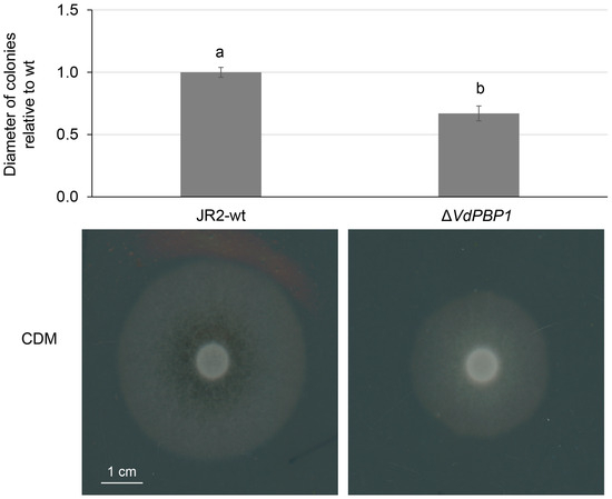VdPBP1 is required for hyphal development of V. dahliae. The same number of spores of JR2-wt VdPBP1 deletion strains was dropped on CDM plates and grown in the dark at 25 °C for ten days. The development of aerial hyphae was observed on the surface of plates. Average values and standard deviation are shown. The letters a and b indicate the groups that are significantly different, calculated by Tukey–Kramer multiple comparison procedures, α = 0.01. Scale bars are displayed.