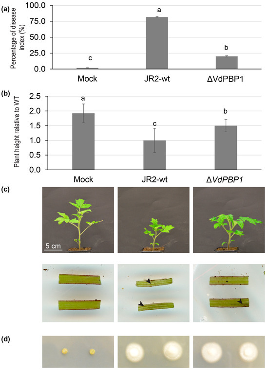 Tomato plants infected with the wild type exhibited a high percentage of disease index, reaching 81.67%, while uninfected plants (Mock) and plants infected with the VdPBP1 mutant had percentages of disease indices of 1.6% and 20%, respectively (Figure 6a). However, severe disease symptoms were observed exclusively in tomato plants infected with the wild type. These symptoms included severe stunting, leaf chlorosis, and discoloration of the vascular system, as depicted in Figure 6.