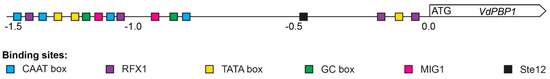 Schematic outline of VdPBP1 promoter regions with unique transcription factor-binding sites. Binding sites of transcription factors on the promoter region of VdPBP1 were identified with the PROMO program. Transcription start site of genes (TSS) was predicted based on the cDNA sequence and protein-coding sequence of VdJR2 in the Ensembl Fungi database. A 1500 bp part of the VdPBP1 promoter regions was analyzed and the TATA box within the core promoter, the CCAAT box, and the GC box of promoter-proximal elements as well as the Rfx1, Mig1, and the Ste12 sites are highlighted.