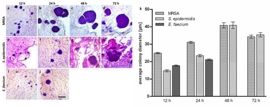 Time-dependent progression of bacterial growth of various cocci species in the hpBIOM. Hematoxylin–eosin-stained hpBIOMs of MRSA (a–d), S. epidermidis (e–h) and E. faecium (i,j) after 12, 24, 48 and 72 h of maturation (scale bar: 50 µm). (k) Average colony diameter of MRSA (dots), S. epidermidis (squares) and E. faecium (triangles) colonies after 12, 24, 48 and 72 h of incubation. Due to advanced hpBIOM degradation, no further sampling was carried out for E. faecium after 24 h. (Values expressed as mean ± SD; statistical analyses revealed no significant differences).