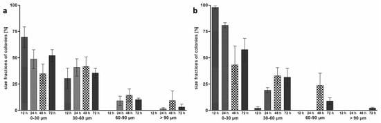 Size distribution of MRSA and Staphylococcus epidermidis colonies in the hpBIOM. Fractions [%] of colonies with diameters of 0–30 µm, 30–60 µm, 60–90 µm and >90 µm after 12, 24, 48 and 72 h with MRSA (a) and with S. epidermidis (b). (Values expressed as mean ± SD; statistical analyses revealed no significant differences).