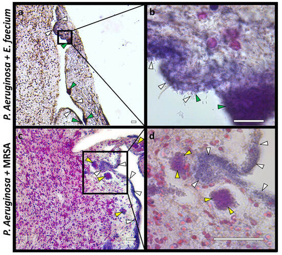 Histological overview and detailed images of multispecies hpBIOMs. Hematoxylin–eosin staining of 24 h matured hpBIOMs with P. aeruginosa combined with E. faecium (a,b) and P. aeruginosa and MRSA (c,d) (P. aeruginosa, white arrows; E. faecium, green arrows; and MRSA, yellow arrows). (Scale bar: 25 µm).