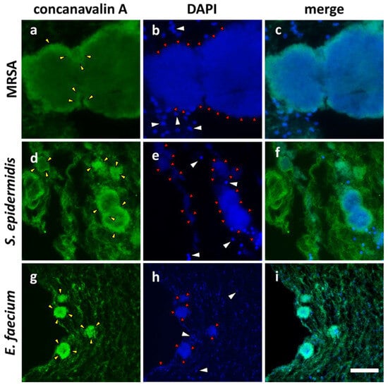 Immunohistochemical staining of the hpBIOM glycocalyx. Carbohydrates were detected using FITC-conjugated Concanavalin A (yellow arrows). Bacterial (red arrows) and cellular nucleic acids (white arrows) were stained with DAPI (blue). MRSA-hpBIOM (48 h) (a–c), S. epidermidis (48 h) hpBIOM (d–f) and E. faecium biofilm (24 h) (g–i). (Scale bar: 50 µm).