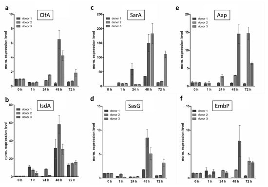 Time-dependent expression of virulence factors in hpBIOMs of three different blood donors. Expression levels of various potential virulence factors isolated in hpBIOMs with MRSA (a–d) and S. epidermidis (e,f) after 0, 1, 24, 48 and 72 h of maturation (triplets each). (a) ClfA, (b) IsdA, (c) SarA, (d) SasG, (e) Aap and (f) EmbP. (Values expressed as mean ± SD).