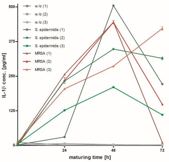 Interleukin 1β (IL-1β) concentration in hpBIOMs after different maturation times. Concentration of IL-1β (pg/mL) in hpBIOMs with MRSA (red), S. epidermidis (green) and w/o (gray) after 1, 24, 48 and 72 h of maturation.