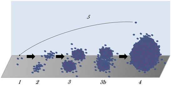 For all tested cocci, MRSA, S. epidermidis and E. faecium, colony formation was detected within 12 h of maturation (Figure 1). MRSA had markedly larger colonies than the other two species, especially between 12 h and 24 h. Colonization with E. faecium resulted in higher degradation of the fibrin matrix of the hpBIOM compared to MRSA or S. epidermidis, which prevented the collection and investigation of biofilms after 24 h. Both the growth rate as well as the absolute size of the colonies at the different time points revealed large differences between the tested species. For MRSA and S. epidermidis, a decrease in the average diameter was observed between 48 h and 72 h (Figure 1k). This can be explained by the sudden increase in small colonies (0–30 µm in diameter) during this time (Figure 2). This leads to a smaller average size, despite the remaining large colonies. When describing biofilm maturation, spreading, a process where single bacteria detach from the biofilm after advanced maturation and convert back into the planktonic form generating new colonies in another location, represents an important process [] (Figure 7). The increasing number of small colonies during the maturation of the hpBIOM could be most likely explained by spreading events initiating after 48 h of maturation. This, in turn, suggests that the average maturation time to a mature biofilm requires about two days.