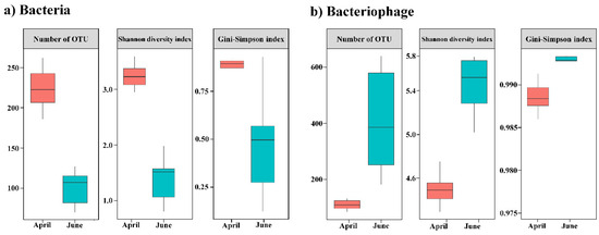 Changes in alpha diversity indices for the bacteriophage and bacterial communities in the sub-Arctic Kongsfjorden between April and June 2018. (a) Common bacteria and (b) bacteriophage operational taxonomic units (OTUs). Box plots showing alpha diversity based on the number of OTUs, Shannon diversity, and Gini–Simpson index.