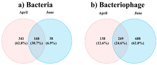 Consistent with the NMDS results, the PERMANOVA results indicated significant differences by month (p < 0.01) but not by water layer (p > 0.05) (Table 1). Thus, the bacteriophage and bacterial communities were divided based on sampling months but not on the basis of water depths. The Venn diagram in Figure 3 illustrates the overlap between April and June for the total bacteria and bacteriophages. The bacterial OTUs showed a 30.7% overlap (168 taxa) across the two months, whereas 62.8% (341 taxa) and 6.9% (38 taxa) represented unique bacterial OTUs in April and June, respectively. The total bacteriophage OTUs showed a 24.6% overlap (269 taxa) across the two months, whereas 12.6% (138 taxa) and 6.28% (688 taxa) were unique bacteriophage OTUs in April and June, respectively.