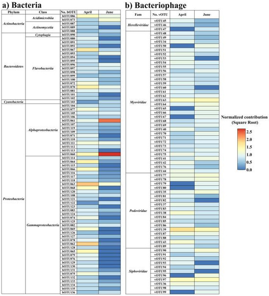 Changes in bacterial (a) and bacteriophage (b) operational taxonomic units (OTUs) in the sub-Arctic Kongsfjorden in April and June 2018. (a) Common bacteria OTUs (at mean relative abundances > 0.5%). (b) Common bacteriophage OTUs (at a mean relative abundance > 0.5%). The heatmap displays the square root normalized data.