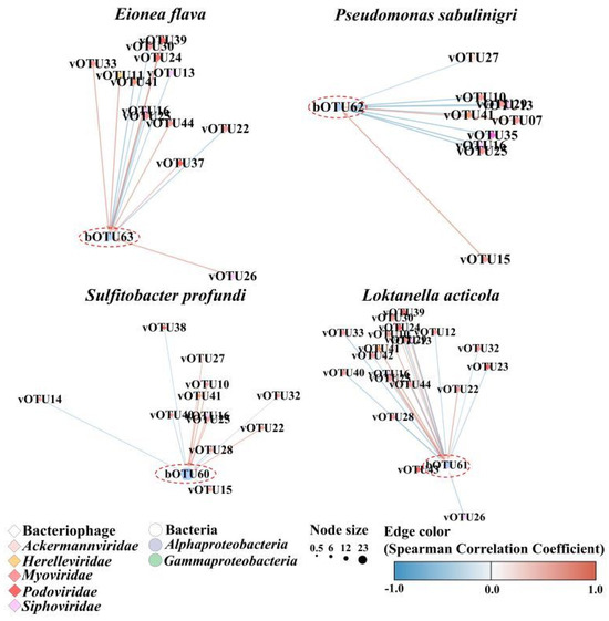 Spearman’s correlation analyses were performed to assess the significance of the associations between the common bacteriophages and bacterial OTUs. Based on significant correlation coefficients, 24 bOTUs were correlated with 11 vOTUs (Table S4). The predominant bacterial taxa for each month correlated with certain bacteriophages (Figure 5). Specifically, Eionea flava (bOTU063), the predominant taxon in April, was significantly correlated with two Podoviridae taxa (Puniceispirillum phage HMO-2011, vOTU39, and Pelagibacter phage HTVC019P, vOTU38) and one Myoviridae (Yersinia phage fHe-Yen9-0, vOTU44). Pseudomonas sabulinigri (bOTU062) was significantly correlated with three Myoviridae (Sphingomonas phage PAU, vOTU40; Synechococcus phage S-WAM2, vOTU42; and Yersinia phage fHe-Yen9-04, vOTU44) and two Podoviridae OTUs (Pelagibacter phage HTVC019P, vOTU38, and Puniceispirillum phage HMO-2011, vOTU39). In addition, Sulfitobacter profundi (bOTU060) and Loktanella acticola (bOTU061; the predominant taxa in June) were significantly correlated with Myoviridae (Synechococcus phage S-WAM7, vOTU41).