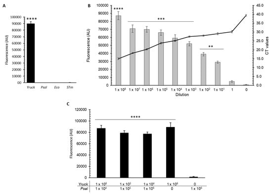 Detection of Y. ruckeri DNA from planktonic samples using a CRISPR/Cas13a-based assay. (A) CRISPR/Cas13a-based assay from 1 ng of purified gDNA of Y. ruckeri (Yruck), P. salmonis (Psal), E. coli (Eco), and S. Typhimurium (STm), respectively. RPA was performed from each gDNA, and the detection was performed through fluorescence-based readouts. (B) CRISPR/Cas13a-based assay from total nucleic acids of bacterial lysates serially diluted from an initial planktonic culture of 1 × 108 cell/mL of Y. ruckeri. The bars show the measured fluorescence, and the line shows the Ct value obtained from a qPCR assay performed with the same samples. (C) CRISPR/Cas13a-based assay from mixtures of bacterial lysates from planktonic cultures of Y. ruckeri and P. salmonis. Dilutions were prepared at 1 × 106, 1 × 105, and 1 × 104 cell/mL and 500 µL of each dilution was mixed as indicated in the figure. The mixtures were then incubated at 95 °C for bacterial lysis and subsequent detection of Y. ruckeri by fluorescence. From each of these lysates, 4 µL was used for detection analysis. AU: arbitrary units. Asterisks represent statistical differences with respect to the control or blank (** p < 0.01, *** p < 0.001, and **** p < 0.0001). Data represent the means ± standard deviations.