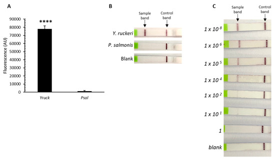 We also evaluated the capability of the platform to detect Y. ruckeri from biofilms formed in marine broth, using P. salmonis as the control. Fluorescence readouts were also only obtained from the samples of Y. ruckeri biofilms (Figure 2A), demonstrating that this detection assay is also effective in conditions mimicking the aquaculture settings, because this bacterium can form biofilms in salmon farms, which presents an additional challenge for the detection and control of this fish pathogen. We then tested a lateral-flow readout method, allowing for visual detection on commercial lateral flow strips, as previously reported [16]. The specific detection was possible from biofilm samples in <70 min (Figure 2B), evidencing a high sensitivity as demonstrated by the significant fluorescence signal even from the biofilm sample obtained from the lowest initial bacterial inoculum (1 × 10 cells/mL) (Figure 2C).