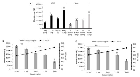 To also evaluate the CRISPR/Cas13a-based assay for the detection of Y. ruckeri transcripts from planktonic and biofilm samples, we designed crRNA to specifically detect sRNAs used as markers of stress (antibiotic exposure) and physiological responses (biofilm formation) in Y. ruckeri. Thus, the platform was used to detect the expression of the MicA sRNA (CRISPR/Cas13a/crRNA-MicA platform), from Y. ruckeri planktonic cultures treated with oxytetracycline, and of the RprA sRNA (CRISPR/Cas13a/crRNA-RprA platform), from Y. ruckeri biofilm samples. From the total RNAs extracted from these samples, an isothermal amplification process of a specific sequence of the sRNAs to be detected was performed, using the RT-RPA technique. Then, we proceeded with the in vitro transcription of these RT-RPA amplicons. Finally, the MicA and RprA sRNAs were specifically detected from planktonic and biofilm samples, respectively, using the fluorescent readout method (Figure 3A). As sensitivity controls, the expression induction of MicA and RprA was also analyzed using qRT-PCR (Figure 3B,C) and represented as Ct values. To determine the detection limit of this assay, various dilutions of the extracted total RNAs were used, which were then treated in the same way as the undiluted total RNAs. As shown in Figure 3B,C, comparing fluorescence-based readouts and Ct values, the sensitivity of the CRISPR/Cas13a/crRNA-sRNAs platforms were once again comparable to that of a qRT-PCR analysis, being able to detect a total RNA concentration of 2 aM used as the initial template.