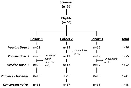 Healthy US adult volunteers were vaccinated intradermally in three cohorts with 25 μg dscCfaE + 100 ng LTR192G on study days 0, 21, and 42 (Figure 1). No placebo vaccinations were utilized. Vaccinated subjects were eligible for challenge 28 days after receiving their third vaccination if they continued to meet the inclusion and exclusion criteria. Unvaccinated, naïve subjects were recruited for challenge to confirm challenge attack rates and to enable estimates of preliminary efficacy. Though originally intended to be a two-cohort study, discrepancies in attack rates in naïve subjects between the initial two cohorts, as delineated below, led to the addition of a third cohort. This Phase 2b vaccination-challenge study was approved by the Naval Medical Research Command (NMRC.2013.0011) and the Western Institutional Review Boards (WIRB PRO NUM: 20130827) in compliance with all Federal regulations governing the protection of human subjects and was registered in ClinicalTrials.gov (ClinicalTrials.gov Identifier: NCT01922856).