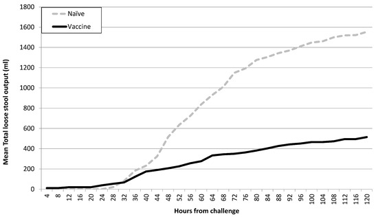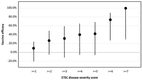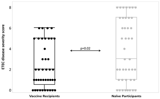 Across all cohorts, vaccination was associated with milder disease in terms of non-diarrheal outcomes such as abdominal cramps, pain, and vomiting (Table 5). Additionally, the mean loose stool output among vaccine recipients was lower than in naïve subjects both as a measure of total output (631 mL and 1446 mL, respectively; p = 0.03) as well as maximum 24 h output (475 mL and 1037 mL, respectively; p = 0.02). This was also a clear reduction in the mean loose stool output in the 120 h post-challenge (Figure 2). Finally, ETEC disease severity was significantly lower (p = 0.02) in vaccine recipients (median: 2; interquartile range: 1–5) compared to naïve subjects (median: 3; interquartile range: 1–7) (Figure 3) which corresponded to increasing vaccine efficacy with increasing disease severity (Figure 4).