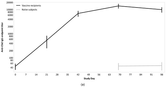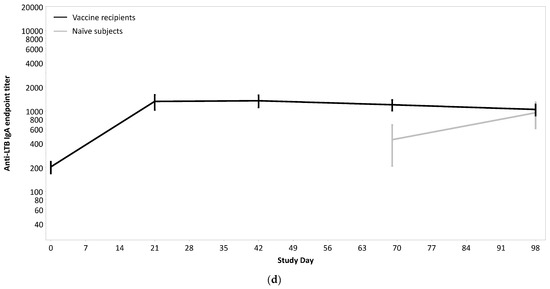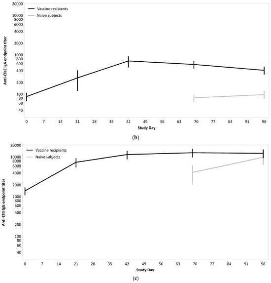 Among vaccinees, all subjects (100%) had at least a four-fold increase in serum IgG Ab titers to CfaE (Table 6 and Figure 5a), and the magnitude of response appeared to increase throughout the vaccination series. Serum IgA responses to CfaE were lower (61.0%; n = 25) with a lower magnitude of response and appeared to plateau after the second vaccination (Figure 5b). Anti-LTB responses also appeared to peak prior to receipt of the third vaccination with observed IgG response rates of 87.8% (n = 26) and IgA response rates of 63.4% (n = 26). During the challenge period, antibody (IgG and IgA) titers to both antigens remained approximately the same as pre-challenge titers among vaccine recipients (Figure 5c,d). Among naïve subjects, anti-CfaE titers were also relatively unchanged with only a slight, non-significant increase in IgA titers. Anti-LTB IgG and IgA Ab titers appeared to increase post-challenge in naïve participants; however, these increases were not statistically significant.
