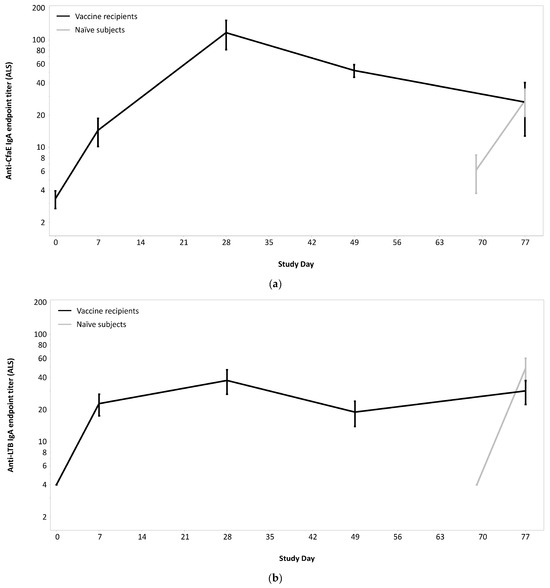 (a) Antibody in lymphocyte supernatant responses (anti-CfaE IgA endpoint titers) after vaccination and/or challenge with H10407; (b) antibody in lymphocyte supernatant (ALS) responses (anti-LTB IgA endpoint titers) after vaccination and/or challenge with H10407.