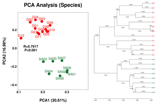 PCA plot (left) and hierarchical clustering dendrogram (right) of OTU-derived bacterial species of the lichens from the Venezuelan Guiana Shield (red) and the South African Highveld Plateau (green). PCA plots at higher taxa (genus, family, order, class, and phylum) are shown in Figure S6.