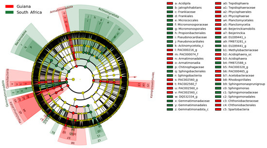 Microbiomic biomarkers of bacteria associated with the lichens from the Venezuelan Guiana Shield (red) and the South African Highveld Plateau (green), as shown in the cladogram generated by LEfSe [40]. The concentrically arranged nodes correspond to the domain bacteria, phylum, class, order, family, genus, and species from innermost to outermost. Red and green nodes/shades indicate significantly higher relative abundances of taxa. The diameters of the node circles are proportional to the abundance of corresponding taxa.