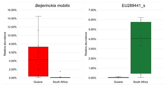 Significant differences (p < 0.05) in relative abundances of the most substantial biomarker OTUs from the Venezuelan Guiana Shield (red) and the South African Highveld Plateau (green) analyzed by ANCOM-BC. (Left) the most substantial biomarker for the Venezuelan Guiana Shield, Beijerinckia mobilis affiliated with the phylum Pseudomonadota. (Right) the most substantial biomarker for the South African Highveld Plateau, EU289441_s, affiliated with the genus Lichenibacterium of the same phylum Pseudomonadota. The bottoms and tops of boxes indicate the first and third quartiles, respectively; the bottoms and tops of whiskers indicate the 1.5 interquartile range beyond the lower and upper quartiles, respectively; the circles indicate the original data (including outliers); the crosses indicate the averages; and the horizontal lines indicate the medians. Other substantial biomarker OTUs are shown in Figure S7.