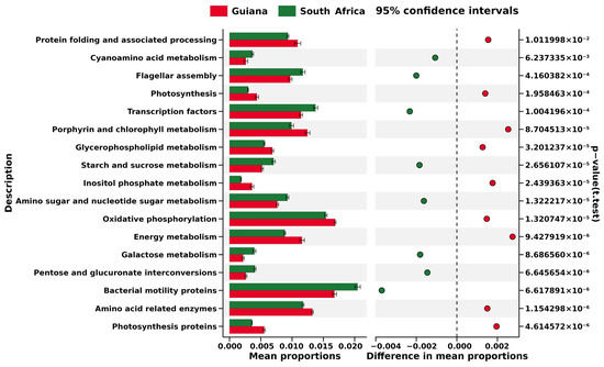 At Level 3, i.e., the most miniature metabolic category on the KEGG database, each biomarker OTU was related to 237 pathways (Figure S10), among which significant differences were identified in “transporters” (4.31% in Guiana and 4.91% in South Africa) and “bacterial motility proteins” (1.66% in Guiana and 2.04% in South Africa); however, the greatest difference was only 0.59%, identified in “transporters”. In addition, only 17 KEGG Level 3 metabolic pathways were found in the biomarker OTUs from Guiana (red) and South Africa (green), suggesting that metabolic pathways predicted from the two regions were different (Figure 6).
