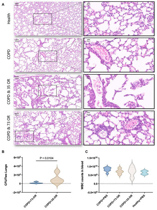 The bacterial burden between the 35-OR- and 73-OR-infected groups was compared using a two-tailed Mann–Whitney U-test. Pulmonary clearance and WBC count in mice belonging to the CO, 73-OR-, and 35-OR-infected groups were compared using a one-way analysis of variance (ANOVA). Western blot results were analyzed using ImageJ 1.53a (National Institutes of Health, Bethesda, MD, USA). Differences were considered statistically significant at p < 0.05.