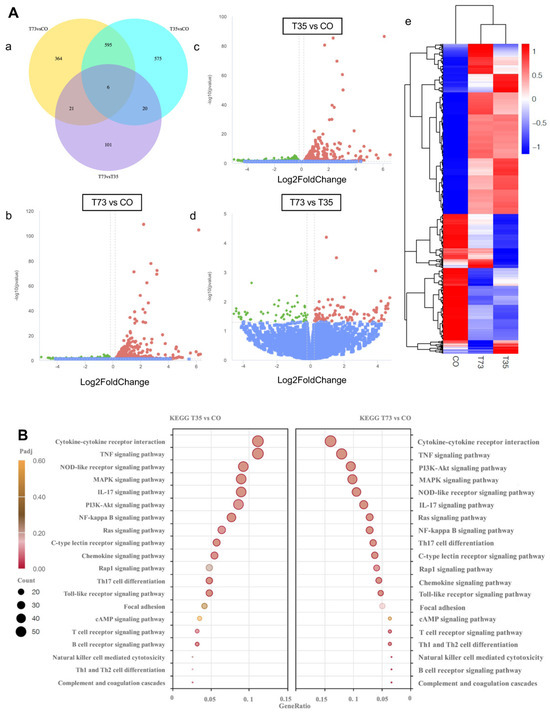 The main difference between COPD mice infected with different phenotypic isolates was the pulmonary clearance rate. We then performed transcriptome sequencing of lung epithelial A549 cells infected with different phenotypic isolates. Transcriptome data were processed based on upregulated and downregulated differentially expressed genes (DEGs). A false discovery rate (FDR) of <0.05 and |log2Fold Change| of ≥0 were set as the cutoffs for DEG selection. Venn mapping showed 561 common DEGs between the T73 and CO groups and between T35 and CO groups (Figure 2Aa). In the comparison between the T73 and CO groups, 986 DEGs were identified (Figure 2Ab); 1196 DEGs were detected in the T35 and CO group comparison (Figure 2Ac). An additional 148 DEGs were identified between the T73 and T35 groups, of which 90 DEGs were upregulated, and 58 were downregulated in the T73 group compared with those in the T35 group (Figure 2Ad). The heatCluster graph indicated no complete separation between the T73 and T35 groups, but clustering could be observed (Figure 2Ae).