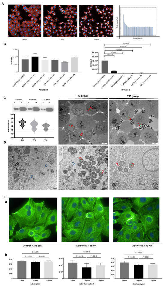 In addition, the F-actin/G-actin ratio exhibited a downward trend after infection; this decline was more evident in the T35 group (Figure 3C). In contrast, the G-actin level was not significantly affected by infection. Moreover, electron microscopy images of A549 cells co-cultured with M. catarrhalis revealed that the 73-OR was more likely to invade A549 cells (Figure 3Dii,Diii), whereas the 35-OR was more likely to adhere to the cell surface (Figure 3Div,Dv). Additionally, abundant microfilaments were commonly observed in the T73 group, whereas microfilaments were rarely observed in the T35 group. Numerous microfilaments were also observed in normal epithelial cells to maintain cell shape (Figure 3Di).