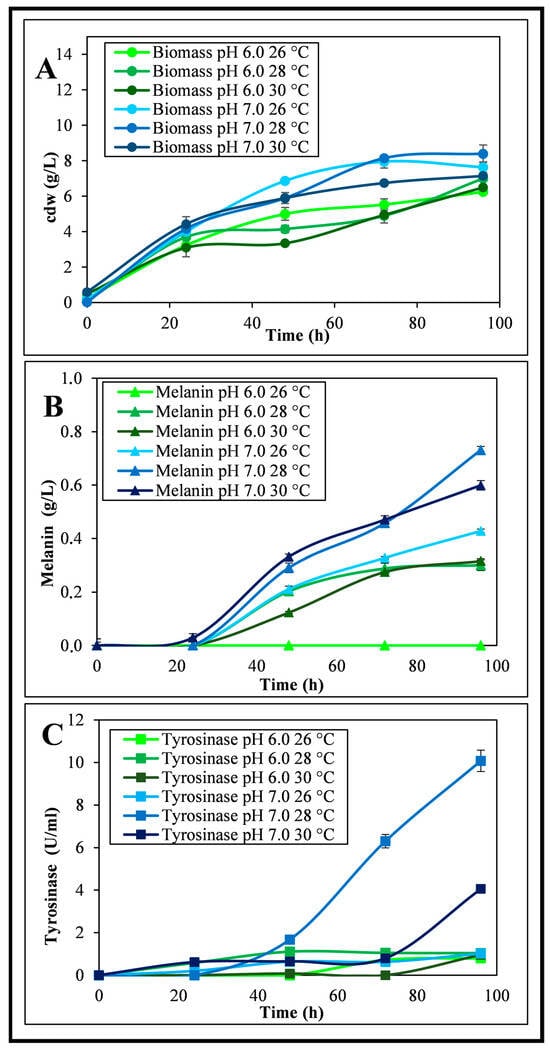 S. nashvillensis growth in shake flasks on GEM III N medium at different pH and temperature conditions up to 96 h: kinetics of biomass formation (A), melanin production (B), and secreted tyrosinase activity (C).