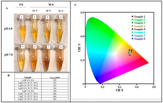 Colorimetric analyses of the broth supernatant samples of S. nashvillensis shake flask growth performed at different pH and temperature conditions: pictures of the samples (1 mL) at the beginning of the growth (0 h, at pH values 6.0 and 7.0—samples 1 and 5, respectively) and at the end of the growth (96 h, at pH 6.0 and 26, 28, and 30 °C—samples 2, 3, and 4, respectively; and at pH 7.0 and 26, 28, and 30 °C—samples 6, 7, and 8, respectively) (A) and their dominant wavelength values (λDOM) in the visible spectrum (B). The representation of the x and y coordinates of all the samples in the CIE diagram 1931 shows a change in color from the light yellow-orange color of the initial supernatant samples (samples 1 and 5) towards a dark pink-orange color of the 96-h supernatant sample obtained at pH 7.0 and 28 °C (sample 7), at which the higher melanin production was determined (C).