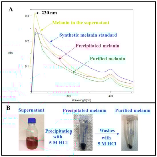 Superposition of UV-visible spectra of the synthetic melanin standard and of the melanin produced by S. nashvillensis as present in the broth supernatant (yellow line), after a first step of precipitation (red line) and after a further step of purification (green line) (A), obtained following a simple two-step purification procedure (B). The maximum peak at 220 nm is indicated by the arrow.