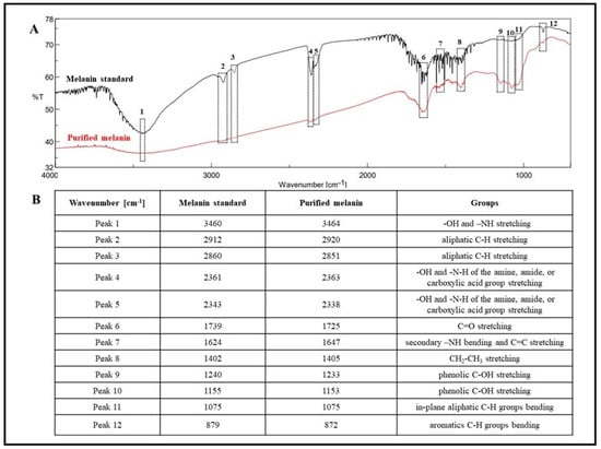 The purified melanin (1.3 mg) was mixed with KBr powder (199.0 mg) in an agate mortar, grounded, and then pressed in the form of a translucent disc to be scanned by Fourier-transform infrared spectroscopy (FT-IR) using a FT-IR-4700 instrument (Jasco, Tokio, Japan). Spectra were recorded in triplicate in the 4000–700 cm−1 range using 600 scans and a resolution of 2.0 cm−1. The synthetic melanin standard was analyzed under the same conditions.