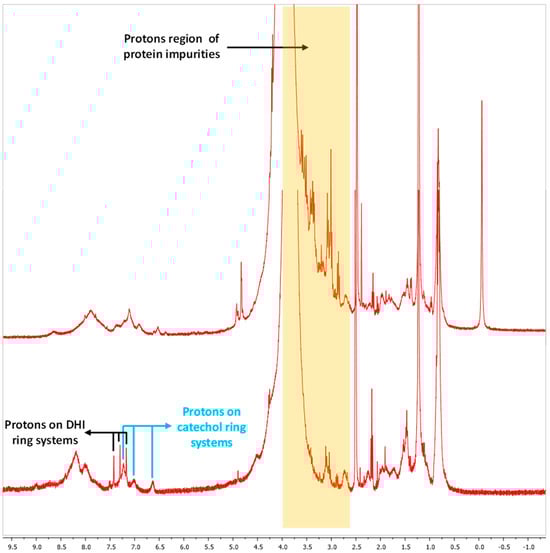 Both the precipitated (36.4 mg) and purified melanin samples (27.4 mg) were dissolved in DMSO-d6 as solvent and analyzed by NMR spectroscopy. 1H NMR spectra were recorded with a Bruker DRX-400 MHz instrument (Bruker Corporation, Billerica, MA, USA), whereas 1H,1H COSY experiments were run at 400.1 MHz using standard pulse programs.