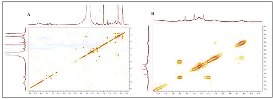 1H,1H COSY spectrum (DMSO-d6) of the purified melanin pigment (A). Expansion of the aromatic protons region (B).