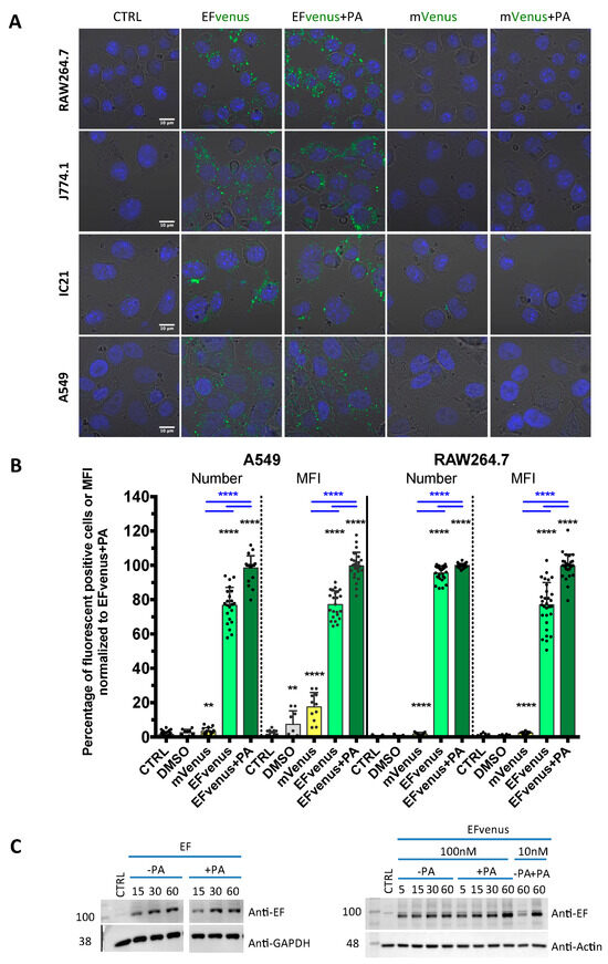 EFvenus is able to enter cells, and the signal is specific. (A) RAW264.7, J774.1, and IC21 macrophage cell lines or A549 epithelial cells were exposed for 1 h to 100 nM of mVenus or EFvenus without or with 300 nM of PA at 37 °C. Fluorescence was observed under confocal microscopy with nucleus staining with DAPI (blue), mVenus and EFvenus appearing in green. (B) Macrophage cell lines RAW264.7 and epithelial cell line A549 were exposed for 1 h with 100 nM of mVenus or EFvenus, without or with 300 nM of PA. Negative control is cells alone (CTRL) or with 10% DMSO. Fluorescence was observed by flow cytometry for EFvenus (light green), EFvenus + PA (dark green), and mVenus (yellow). Black stars indicate the results of the Mann-Whitney nonparametric test (** p < 0.01, **** p < 0.0001) comparing each condition to the control. Underlined blue stars indicate a statistical difference in comparison with EFvenus + PA. (C) RAW264.7 cells were exposed for 15, 30, or 60 min at 37 °C with 100 nM of EF from List Laboratories or with 10 nM or 100 nM EFvenus, without or with 300 nM of PA. Cell lysates were analyzed by western blot with antibodies against EF (89 kDa), actin (42 kDa), or GAPDH (37 kDa).