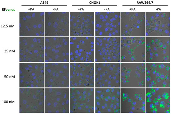 EFvenus entry into cells is detected at various protein concentrations independently of the presence of PA. RAW264.7, CHOK1, and A549 cells were exposed to different concentrations of EFvenus ranging from 12.5 nM to 100 nM, without PA (−PA) or with 300 nM of PA (+PA) for 1 h at 37 °C. Fluorescence was then observed under confocal microscopy. The nucleus appeared in blue, and the EFvenus in green.
