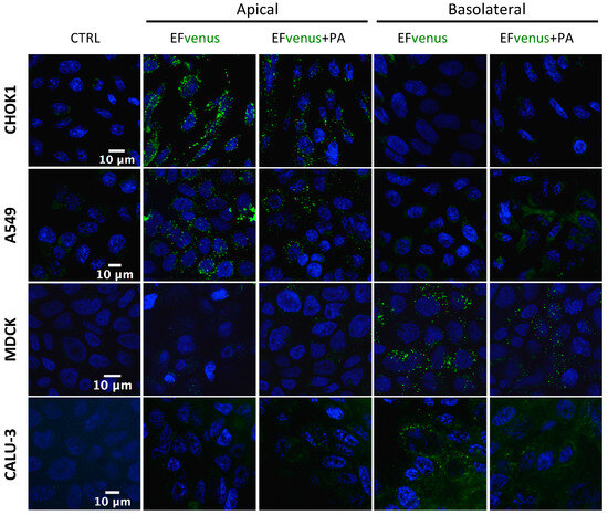 EFvenus entry into epithelial cells is pole dependent. CHOK1, A549, MDCK, and Calu-3 epithelial cell lines were exposed for 1 h at 37 °C to EFvenus (100 nM), with or without PA (300 nM), at the apical or basolateral side. Fluorescence was observed under confocal microscopy, with the nucleus in blue and EFvenus in green, and compared to untreated cells (CTRL for control).