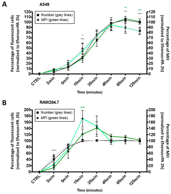 The kinetic profile of EFvenus endocytosis differs between cell types. A549 epithelial cell line (A) and RAW264.7 macrophages (B) were exposed for 2, 5, 10, 20, 40, 60, or 120 min to 100 nM of EFvenus, with or without PA (300 nM) at 37 °C. The number of fluorescent positive cells, normalized to the condition EFvenus + PA at 120 min as 100%, is indicated with square shapes for EFvenus (light grey) and EFvenus + PA (dark grey). The median of fluorescence (MFI) is indicated with round shapes for EFvenus (light green) and EFvenus + PA (dark green). The percentage of MFI for each time was normalized to the MFI of EFvenus + PA at 120 min, representing 100% of MFI. Data were collected three times in duplicate and were represented as mean ± standard deviation. Stars represent statistical differences between EFvenus and EFvenus + PA for the number of fluorescent cells (black stars) or for the MFI (green stars). Statistical analysis was conducted using two-way ANOVA and Bonferroni multiple comparison test, with * p < 0.05, ** p < 0.01, *** p < 0.001, **** p < 0.0001.