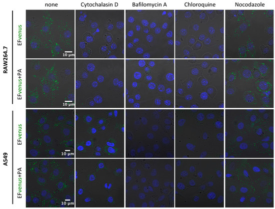 Implication of cytoskeleton and pH of endosomes in EFvenus entry. RAW264.7 or A549 cells were incubated without inhibitor (none) or with cytochalasin D, bafilomycin A, chloroquine, or nocodazole for 30 min at 37 °C and then exposed for 1 h with EFvenus (100 nM) +/− PA (300 nM). Distribution of endocytosed EFvenus was then observed under confocal microscopy with the nucleus in blue and EFvenus in green.