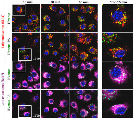 According to previous studies, the complex EF + PA follows early and late endosome trafficking [38,39]. After incubation of RAW264.7 macrophages with EFvenus in the absence or in the presence of PA for 1 h at 37 °C and immunofluorescent staining of endosomes, the localization of EFvenus was monitored according to time. Under our conditions, EFvenus co-localized with EEA1, an early endosome marker, and with Rab7, a late endosome marker, at 15-, 30-, and 60-min post-incubation, in the presence and in the absence of PA (Figure 8).