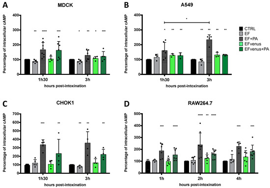 In MDCK cells, an increase in cAMP levels was observed at 90 min for both EFvenus + PA (ETvenus) and commercial EF + PA (ET) (Figure 9A). At the 3 h timepoint, the cAMP level remained higher than the control, with a tendency to decline.